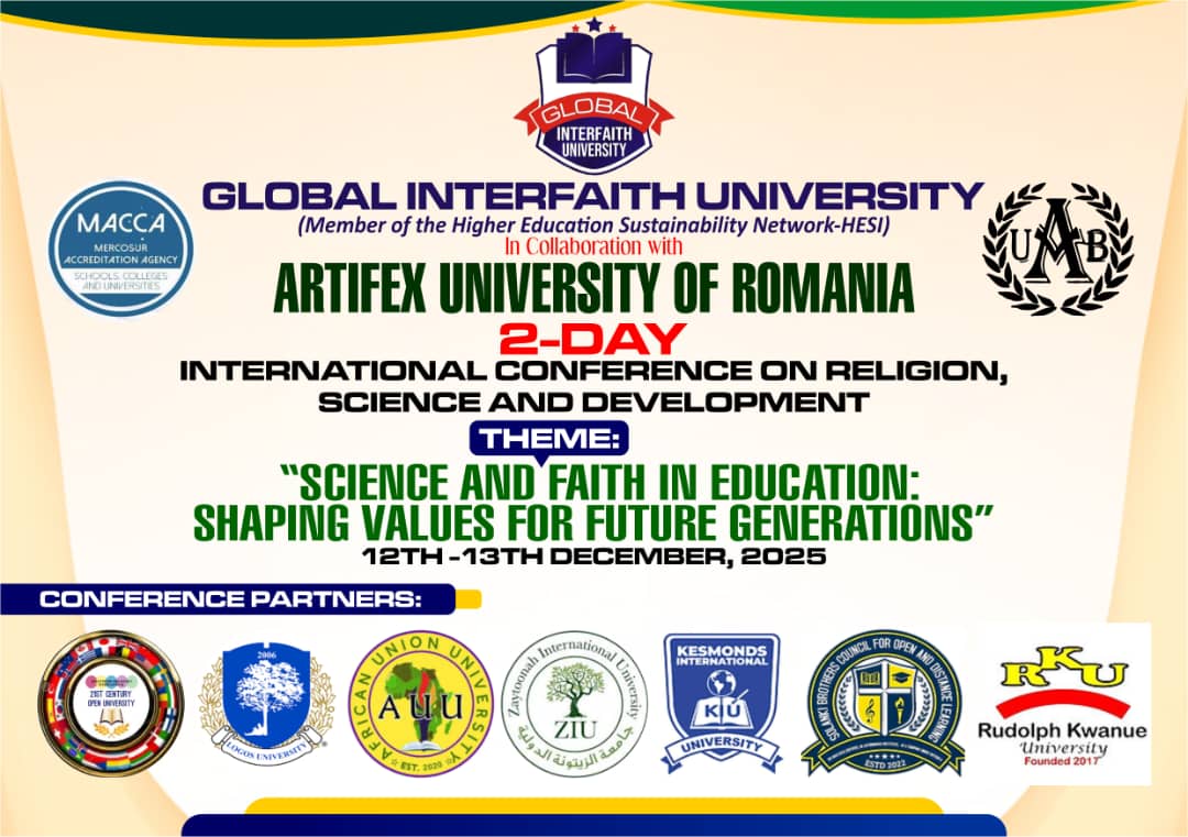 Global Interfaith University and Artifex University of Romania, in partnership with 21st Century Open University and African Union University International, successfully co-hosted the highly anticipated International Conference on Religion, Science, and Development. The event, held on Friday, December 12, 2025, via zoom, centered around the theme “Science and Faith in Education: Shaping Values for Future Generations,” brought together scholars, educators, religious leaders, scientists, and policymakers from around the world to explore the dynamic relationship between spirituality and scientific progress in shaping ethical and moral values for tomorrow’s society.