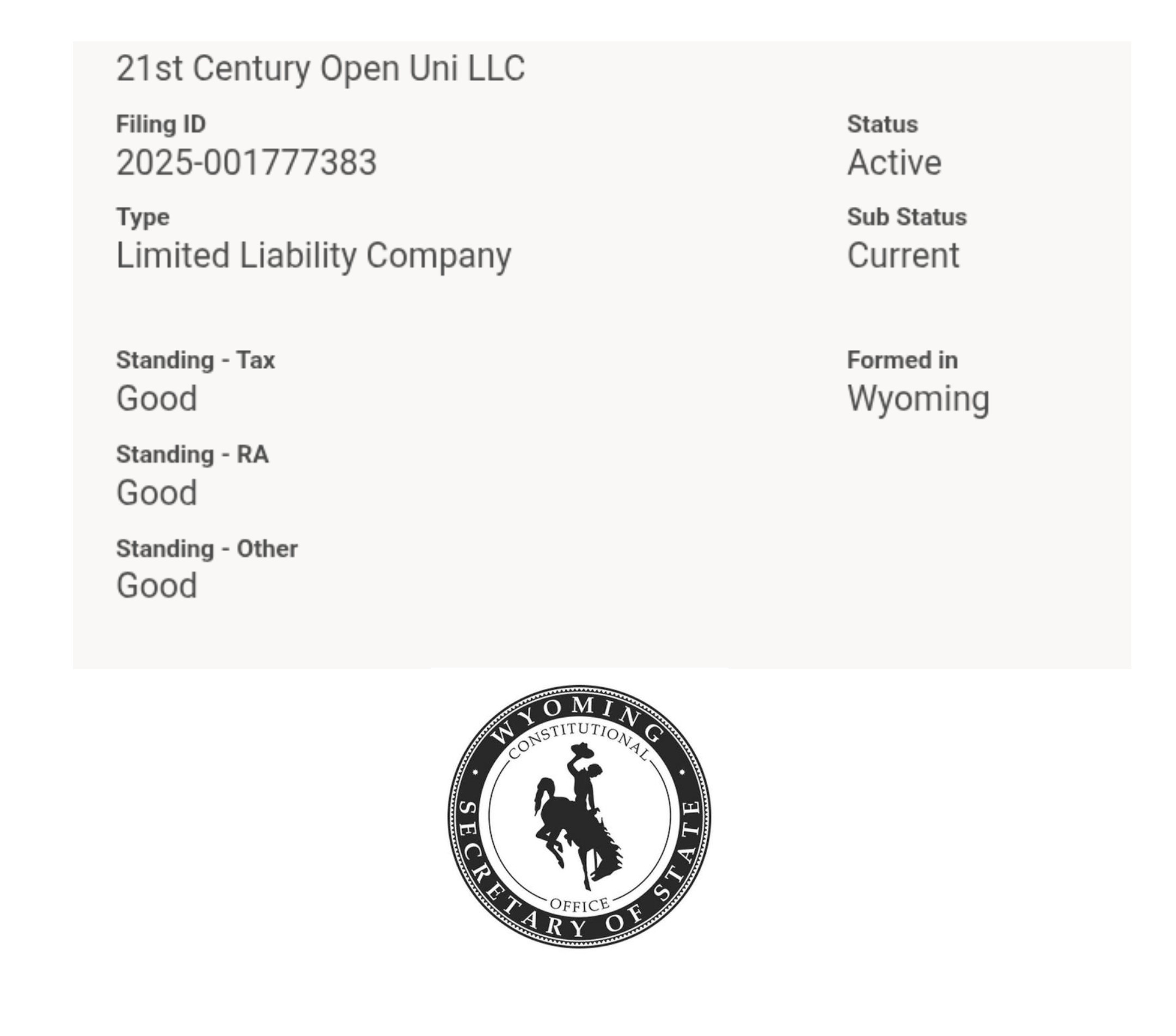 21st Century Open Uni LLC (21st COU LLC) is registered and licensed with File Number 001777383 by the Wyoming Secretary of State, under the Wyoming Business Corporation Act, cited as title 17 of the Wyoming Statutes, with Certificate of Good Standing ID Number 089974242 duly validated. 21st COU LLC Operating Office at Wyoming maintaining all digital records as transferred .